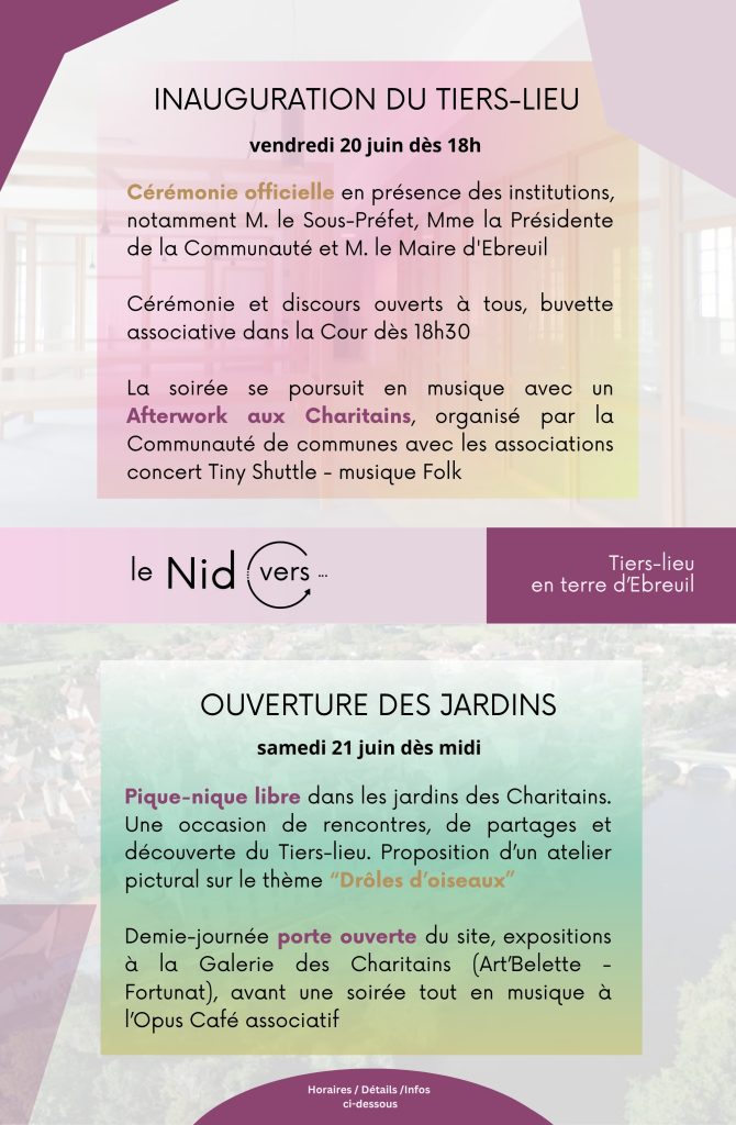 Nous vous invitons dès à présent à découvrir les solutions d’accueil du Nid vers, nouveau tiers-lieu situé à Ébreuil, et à participer aux festivités des 20 et 21 juin – plus d’informations dans la rubrique Événements.